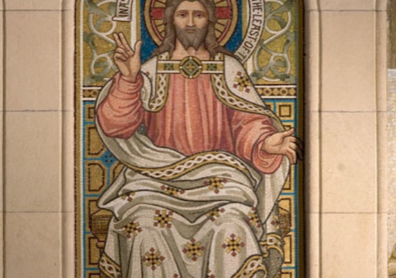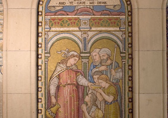 On the interior face of the west wall of the Cathedral, below the rose window, sat seven mosaic panels, installed between 1882 and 1970. Only four panels remain in situ, three having fallen during the 2011 earthquakes. The central panel depicted Christ giving benediction and the other panels featured the six acts of mercy from the Gospel of Matthew Chapter 25, verses 35-36.